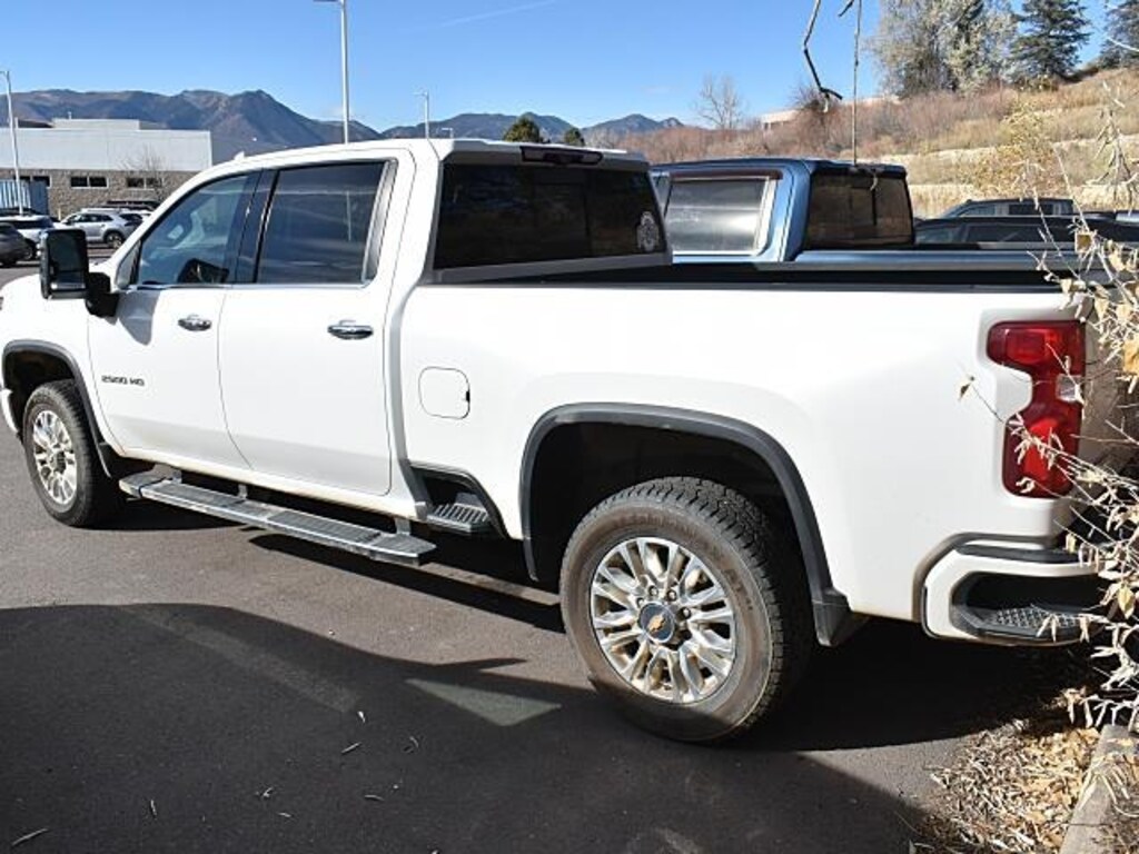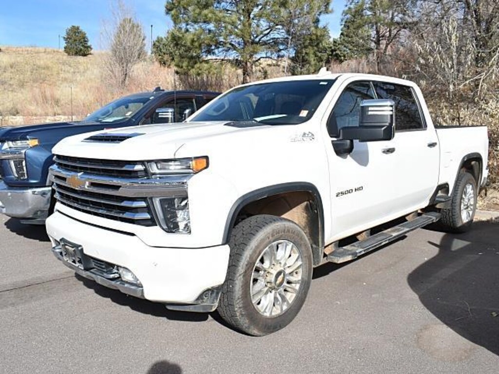 This 2021 Chevrolet Silverado 2500HD High Country, has a Iridescent Pearl Tricoat exterior and Jet Black interior color with only 118,071 miles. Stock Number N210596A. You can connect with us by calling (719) 249-2703. No Accidents! One Owner! OTHER NOTABLE FEATURES AND OPTIONS YOU SHOULD KNOW ABOUT: Z71 Off-Road Package ($325 value)Hill Descent ControlOff-Road SuspensionSkid PlatesSafety Package IISafety Alert SeatIntelliBeam Automatic High Beam On/offFollowing Distance IndicatorForward Collision AlertLane Departure WarningAutomatic Emergency BrakingTechnology PackageRear Camera Mirror15" Diagonal Multicolor Head-Up DisplayPreferred Equipment Group 3LZSiriusXM with 360L10-Way Power Driver Seat Adjuster with LumbarDriver MemoryPower Sliding Rear Window with DefoggerFront Bucket Seats with Center Console10-Way Power Passenger Seat Adjuster with LumbarChevrolet Connected Access CapablePower Front Windows with Passenger Express Up/downPower Rear Windows with Express DownDeep-Tinted GlassKeyless Open and StartPower Front Windows with Driver Express Up/downRear Wheelhouse LinersColor-Keyed Carpeting Floor CoveringFront Carpeted Floor MatsRear Carpeted Floor MatsBluetooth For PhoneRemote Vehicle Starter SystemElectric Rear-Window DefoggerBlack Chevytec Spray-On Bedliner with Chevrolet LogoCompassFloor-Mounted Center ConsoleAuto-Dimming Inside Rearview MirrorChrome Mirror CapsHeated and Auto-Dimming Power Vertical Trailering MirrorsChrome Front GrilleIntegrated Trailer Brake ControllerElectronic Cruise Control with Set and Resume SpeedWireless ChargingHeated Driver and Front Outboard Passenger SeatingHeated 2nd Row Outboard Seats120-Volt Bed Mounted Power OutletHeated Steering Wheel120-Volt Instrument Panel Power OutletVentilated Driver and Front Passenger Seats170 Amp AlternatorElectrical Lock Control Steering ColumnManual Tilt and Telescoping Steering ColumnLeather-Wrapped Steering WheelHitch Guidance with Hitch ViewUp-Level Rear Seat with Storage PackagePerforated Leather-Appointed Seat TrimFront LED Fog LampsAdvanced Trailering SystemHD RadioUltrasonic Front and Rear Park AssistOnStar and Chevrolet Connected Services CapableLED Cargo Area LightingRear Cross Traffic AlertUniversal Home Remote8" Diagonal Multicolor Digital Display DICSteering Wheel Audio ControlsLane Change Alert with Side Blind Zone AlertDual Charge-Only USB Ports (2nd Row)Unauthorized Entry Theft-Deterrent SystemBed View Camera with Two Trailer Camera ProvisionsHD Surround Vision with 2 Trailer View Camera Provisions4G LTE Wi-Fi Hotspot CapableWireless Phone ProjectionHigh Country Deluxe ($1,965 value)Gooseneck/5th Wheel Prep Package Safety and Security Rear camera - Watching your back! The rear camera helps you see obstacles and hazards you otherwise couldn't by showing enhanced images of what is behind you. The rear camera is an extra set of eyes that's both convenient and safe. Rear camera - Watching your back! The rear camera helps you see obstacles and hazards you otherwise couldn't by showing enhanced images of what is behind you. The rear camera is an extra set of eyes that's both convenient and safe.Technology and Telematics Smart device mirroring - Smartphone, meet smart car. You can control your device through your vehicle's infotainment system. Smart device mirroring brings together safety and convenience by making it easier to find what you're looking for while keeping your eyes on the road. Apple CarPlay/Android Auto smart device wireless mirroring Mobile hotspot - WiFi on the fly. Connect your devices to the Internet through your vehicles private mobile hotspot and take the internet wherever your journey takes you, without eating up your data allowance. Find the hotspot with mobile hotspot. EMISSIONS, FEDERAL REQUIREMENTS, ENGINE, DURAMAX 6.6L TURBO-DIESEL V8, TRANSMISSION, ALLISON 10-SPEED AUTOMATIC, GVWR, 11,350 LBS. (5148 KG), REAR AXLE, 3.42 RATIO, WHEELS, 20" (50.8 CM) POLISHED ALUMINUM, IRIDESCENT PEARL TRICOAT, SEATS, FRONT BUCKET, JET BLACK,