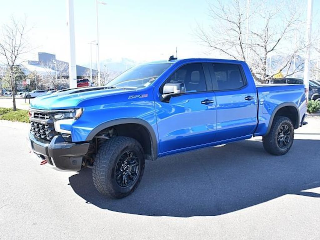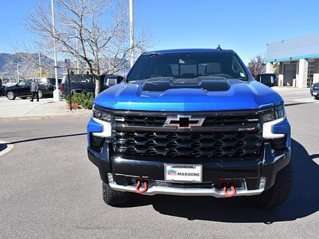 This 2022 Chevrolet Silverado 1500 ZR2, has a Glacier Blue Metallic exterior and Jet Black/Graystone interior color with only 42,184 miles. Stock Number N588459. You can connect with us by calling (719) 249-2703. No Accidents! One Owner! OTHER NOTABLE FEATURES AND OPTIONS YOU SHOULD KNOW ABOUT: Preferred Equipment Group 3LTSiriusXM with 360L10-Way Power Driver Seat with LumbarDriver MemoryPower Sliding Rear Window with Rear DefoggerFront Bucket SeatsPower Front Passenger Windows with Express Up/downPower Rear Windows with Express DownDeep-Tinted GlassKeyless Open and StartColor-Keyed Carpeting Floor CoveringBluetooth For PhoneRemote Vehicle Starter SystemElectric Rear-Window DefoggerFront Rainsensing WipersCompassFloor Mounted Center ConsoleAuto-Dimming Inside Rearview MirrorHigh Gloss Black Mirror CapsSafety Alert SeatHill Descent ControlIntegrated Trailer Brake ControllerHeavy-Duty Air FilterWireless ChargingHeated Driver and Front Outboard Passenger Seats2nd Row Heated Outboard SeatsHeated Steering Wheel120-Volt Instrument Panel Power OutletVentilated Driver and Front Passenger Seats170 Amp Alternator6.2L EcoTec3 V8 EngineElectrical Steering Column LockManual Tilt/telescoping Steering ColumnLeather Wrapped Steering Wheel2-Speed Transfer CaseSkid PlatesWireless Phone ProjectionStandard Tailgate18" X 8.5" Aluminum Machined Face Wheels18" Aluminum Spare WheelUp-Level Rear Seat with Storage PackagePerforated Leather Seat TrimFront LED Fog LampsTrailer Camera ProvisionsPerimeter Lighting2 USB Data PortsDual Rear USB Ports (charge Only)Rear Park Assist12.3" Multicolor Reconfigurable Digital DisplayOnStar and Chevrolet Connected Services CapableTrailering AppLED Cargo Area LightingRear Cross Traffic Alert-BrakingUniversal Home RemoteSteering Wheel Audio ControlsTrailer Side Blind Zone AlertTheft Deterrent System (unauthorized Entry)HD Surround VisionBed View CameraTrailering PackageZR2 Suspension Package Safety and Security Forward collision mitigation - Forward thinking. You look away for just a second and suddenly the vehicle in front of you has stopped. That's when the forward collision mitigation system comes to life. When it senses an impending impact, it will activate a combination of features to help prevent or reduce the severity of an accident. Forward collision mitigation is always looking ahead. Forward collision mitigation - Forward thinking. You look away for just a second and suddenly the vehicle in front of you has stopped. That's when the forward collision mitigation system comes to life. When it senses an impending impact, it will activate a combination of features to help prevent or reduce the severity of an accident. Forward collision mitigation is always looking ahead. Pedestrian impact prevention - An extra step toward safety. Pedestrians don't always stop, look, and listen, but with Pedestrian Impact Prevention, your vehicle is equipped to better see them and avoid them. This system constantly monitors the road ahead to identify and track pedestrians. It projects that image to an interior display screen, AND should an impact become likely, Pedestrian impact prevention takes steps to avoid a collision.Technology and Telematics Apple CarPlay/Android Auto smart device wireless mirroring Wireless Apple CarPlay/Wireless Android Auto smart device wireless mirroring At Mike Maroone Chevrolet North, were here to Serve you! Our staff is 100% dedicated to customer satisfaction and we understand that you need clear, transparent information throughout the car buying process. With our live market pricing philosophy, we offer the right cars at the right price, and the transparency to back it up! FINANCING OPTIONS: Take advantage of our attractive low-rate financing options. Our access to various Credit Unions and National Banks can provide financing for most credit levels. We can tailor a finance package to fit your needs. To get started, complete our secure online credit application. We will review our technicians vehicle