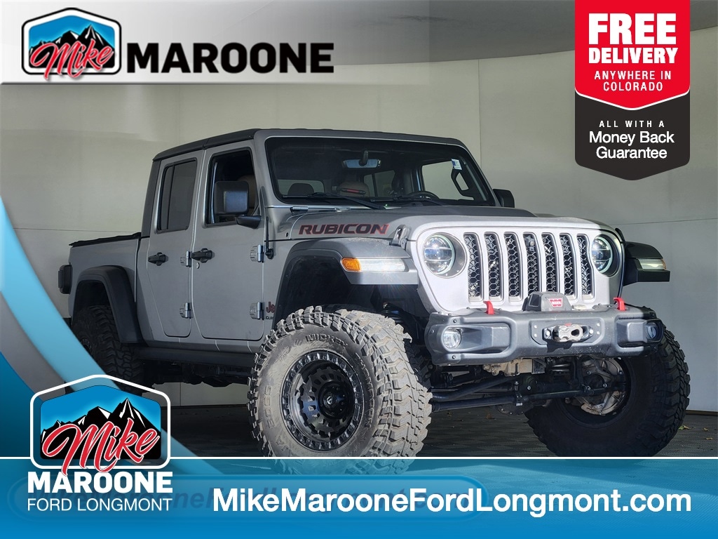 Recent Arrival at Mike Maroone Ford! Clean CARFAX. FREE DELIVERY ANYWHERE IN COLORADO, 4 WHEEL DRIVE, APPLE CARPLAY/ANDROID AUTO, BLUETOOTH/HANDS FREE, REAR BACKUP CAMERA, Billet Silver Metallic exterior paint, Black interior with Black seats, Leather-wrapped park brake and shift knob, Trailer Tow Package, Trac-Lok Anti-Spin Rear Differential, Black Freedom Top 3-piece modular hardtop, Roll-up tonneau cover, Spray-in bedliner, Cold Weather Group (heated front seats, heated steering wheel), LED Lighting Group (LED front fog lamps, LED reflector headlamps, LED taillamps), Remote proximity keyless entry, 17" x 7.5" machined/polished aluminum wheels, 255/75R17C All-Terrain tires, Alpine premium audio system, Uconnect 4C NAV with 8.4" display and GPS navigation, SiriusXM Travel Link subscription, 9-speaker premium audio system with subwoofer, Bluetooth speaker, DOT rated, Off-Road TrailCam, Forward-facing off-road camera, ParkSense Rear Park Assist System, Blind-Spot Monitoring and Rear Cross-Path Detection, Safety Group, Adaptive Cruise Control with Stop, Advanced Brake Assist, Premium Black Sunrider soft top, and 8-speed automatic transmission.. Odometer is 5339 miles below market average! Billet Silver Metallic Clearcoat 2020 Jeep Gladiator Rubicon 4D Crew Cab 3.6L V6 24V VVT 8-Speed Automatic 4WD