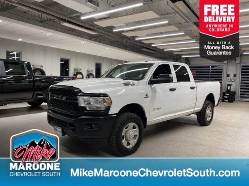 COME SEE THIS BEAUTIFUL 2022 Ram 2500 Tradesman AT MIKE MAROONE CHEVROLET SOUTH 230 N ACADEMY BLVD COLORADO SPRINGS CO, 3 DAY 150 MILE MONEY BACK GUARANTEE**, FREE DELIVERY ANYWHERE IN COLORADO**, 60 DAY POWERTRAIN WARRANTY**, CERTIFIED 1 OWNER VEHICLE**, CLEAN CARFAX - NO ACCIDENTS REPORTED**, 3 FREE MONTHS XM RADIO (IF EQUIPPED)**, 4 WHEEL DRIVE**, 8 COLOR TOUCHSCREEN**, APPLE CARPLAY**, ANDROID AUTO**, AIR CONDITIONING**, ALLOY WHEELS**, BLUETOOTH - HANDS FREE**, FRESH OIL & FILTER CHANGE**, FRONT & REAR BRAKES**, POWER HEATED OUTSIDE MIRRORS**, CRUISE CONTROL**, POWER WINDOWS**, POWER LOCKS**, POWER SEAT**, REAR BACK UP CAMERA**, REAR CROSS TRAFFIC ALERT**, SERVICE RECORDS AVAILABLE**, STEERING WHEEL AUDIO CONTROLS**, TOW PACKAGE**, TRAILERING EQUIPMENT**, BEDLINER**. 4WD Certification Program Details: This 2022 Ram 2500 Tradesman also comes with the FULL Mike Maroone 60-Day warranty. We will review the technician's vehicle inspection report with you before purchase. Our intention is to provide you a completely transparent buying experience. At Mike Maroone our used vehicles are Safety Checked, Warrantied, CARFAX, and if you don't like it ... Bring it back! All of our new and used vehicles come with the Mike Maroone Preferred Owner Advantages listed below: - MARKET BASED PRICING - 3 DAY/150 MILE MONEY BACK GUARANTEE - FREE LOANERS FOR SERVICE GUESTS WHO SET AN ONLINE APPOINTMENT - 12 MONTH/12K MILE SERVICE/COLLISION GUARANTEE - 60 DAY LIMITED POWERTRAIN PRE-OWNED VEHICLE WARRANTY - MILITARY DEPLOYMENT BUYBACK GUARANTEE - FREE DELIVERY ANYWHERE IN COLORADO For more information or vehicles like it, stop by Mike Maroone South today. We are just south of the Citadel Mall on the corner of Academy and Bijou.