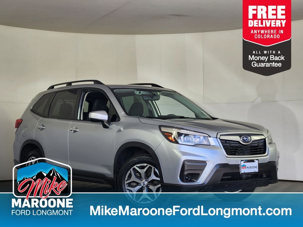 Clean CARFAX. FREE DELIVERY ANYWHERE IN COLORADO, 2019 Subaru Forester Premium AWD, 2.5L 4-Cylinder DOHC 16V Engine w/ Variable Valve Timing, Lineartronic CVT Transmission, All-Wheel Drive (AWD), Ice Silver Metallic Exterior, Black Cloth Interior, All-Weather Package, Heated Front Seats, Heated Exterior Mirrors, Windshield Wiper De-Icer, Blind Spot Detection w/ Rear Cross-Traffic Alert, Power Rear Gate, Keyless Access w/ Push-Button Start, Subaru Starlink 6.5" Multimedia Plus System, Apple CarPlay & Android Auto, Bluetooth Connectivity, Rear View Camera, Adaptive Cruise Control, Lane Departure Warning, Lane Keep Assist, Pre-Collision Braking System, 17" Black Machine Finish Alloy Wheels, All-Season Tires, Roof Rails, 60/40 Split-Fold Rear Seats, Cloth Upholstery, Dome Light LED Upgrade, Traction Control, Vehicle Dynamics Control (VDC), Hill Descent Control, Brake Assist, Tire Pressure Monitoring System (TPMS).. Odometer is 18310 miles below market average! Ice Silver Metallic 2019 Subaru Forester Premium 4D Sport Utility 2.5L 4-Cylinder DOHC 16V VVT Lineartronic CVT AWD
