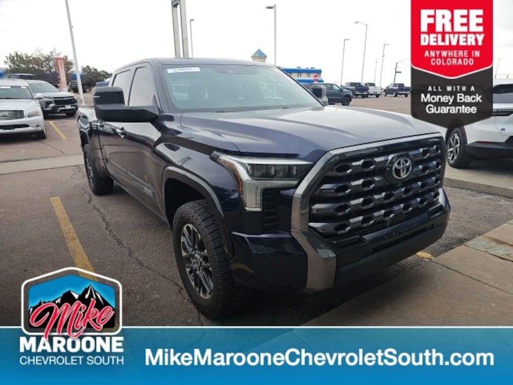 COME SEE THIS BEAUTIFUL 2022 Toyota Tundra Platinum AT MIKE MAROONE CHEVROLET SOUTH 230 N ACADEMY BLVD COLORADO SPRINGS CO, 3 DAY 150 MILE MONEY BACK GUARANTEE**, 60 DAY POWERTRAIN WARRANTY**, 3 FREE MONTHS XM RADIO (IF EQUIPPED)**, 4 WHEEL DRIVE**, 8 COLOR TOUCHSCREEN**, APPLE CARPLAY**, ANDROID AUTO**, AIR CONDITIONING**, ALLOY WHEELS**, AUTO LOCKING REAR DIFFERENTIAL**, BLIND SPOT MONITOR**, BLUETOOTH - HANDS FREE**, FRESH OIL & FILTER CHANGE**, FRONT & REAR BRAKES**, FRONT AND REAR PARK ASSIST**, HEATED AND VENTILATED SEATS**, HEATED SEATS**, HEATED STEERING WHEEL**, LEATHER SEATS**, MEMORY SEATS**, PASSIVE ENTRY SYSTEM**, KEYLESS OPEN**, KEYLESS START**, KEYLESS ENTRY**, POWER HEATED OUTSIDE MIRRORS**, CRUISE CONTROL**, POWER WINDOWS**, POWER LOCKS**, PREMIUM RIDE SUSPENSION**, REAR BACK UP CAMERA**, REAR CROSS TRAFFIC ALERT**, SERVICE RECORDS AVAILABLE**, STEERING WHEEL AUDIO CONTROLS**, TOW PACKAGE**, TRAILERING EQUIPMENT**, BEDLINER**. 4WD Certification Program Details: This 2022 Toyota Tundra Platinum also comes with the FULL Mike Maroone 60-Day warranty. We will review the technician's vehicle inspection report with you before purchase. Our intention is to provide you a completely transparent buying experience. At Mike Maroone our used vehicles are Safety Checked, Warrantied, CARFAX, and if you don't like it ... Bring it back! All of our new and used vehicles come with the Mike Maroone Preferred Owner Advantages listed below: - MARKET BASED PRICING - 3 DAY/150 MILE MONEY BACK GUARANTEE - FREE LOANERS FOR SERVICE GUESTS WHO SET AN ONLINE APPOINTMENT - 12 MONTH/12K MILE SERVICE/COLLISION GUARANTEE - 60 DAY LIMITED POWERTRAIN PRE-OWNED VEHICLE WARRANTY - MILITARY DEPLOYMENT BUYBACK GUARANTEE - FREE DELIVERY ANYWHERE IN COLORADO For more information or vehicles like it, stop by Mike Maroone South today. We are just south of the Citadel Mall on the corner of Academy and Bijou.